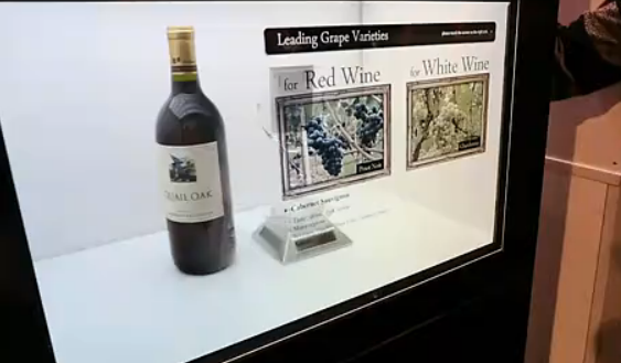 透明的显示屏幕已经不是新鲜事物了,不过这次我们在 CES 2013 上看到的透明显示屏展示柜倒是有几分新意。IL WOO 公司带来的这个新品采用了三星的透明显示屏,同样可以用在一些零售商店商品展示,并且能实现广告互动演示。这个透明屏幕加入了红外触控面板,使得你可以在看内容的时候直接点触查看相关信息,比如点葡萄酒就可以出现相关的场地和介绍等;除此之外,新的系统支持 Flash 展示,这样看过去内容就丰富很多了。口说无凭眼见为实,点击跳转可以看到我们拍摄的一小段介绍影片。
