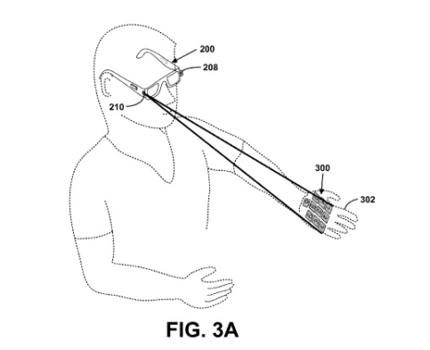 谷歌申请文件举例描述这项专利:眼镜摄像头可以解读用户的手势,用户就能通过点击虚拟按键,或是活动一下手掌,接收或输入信息。